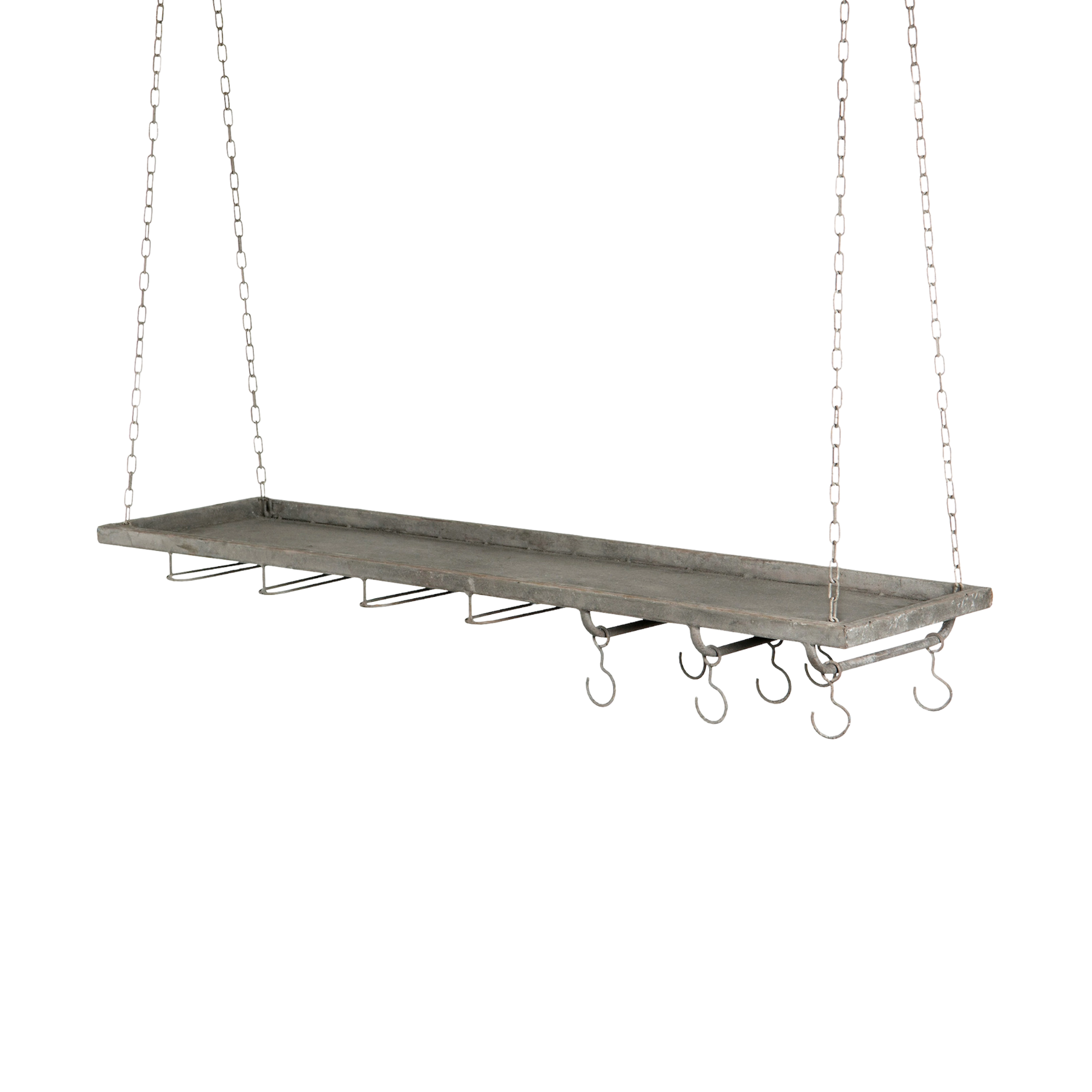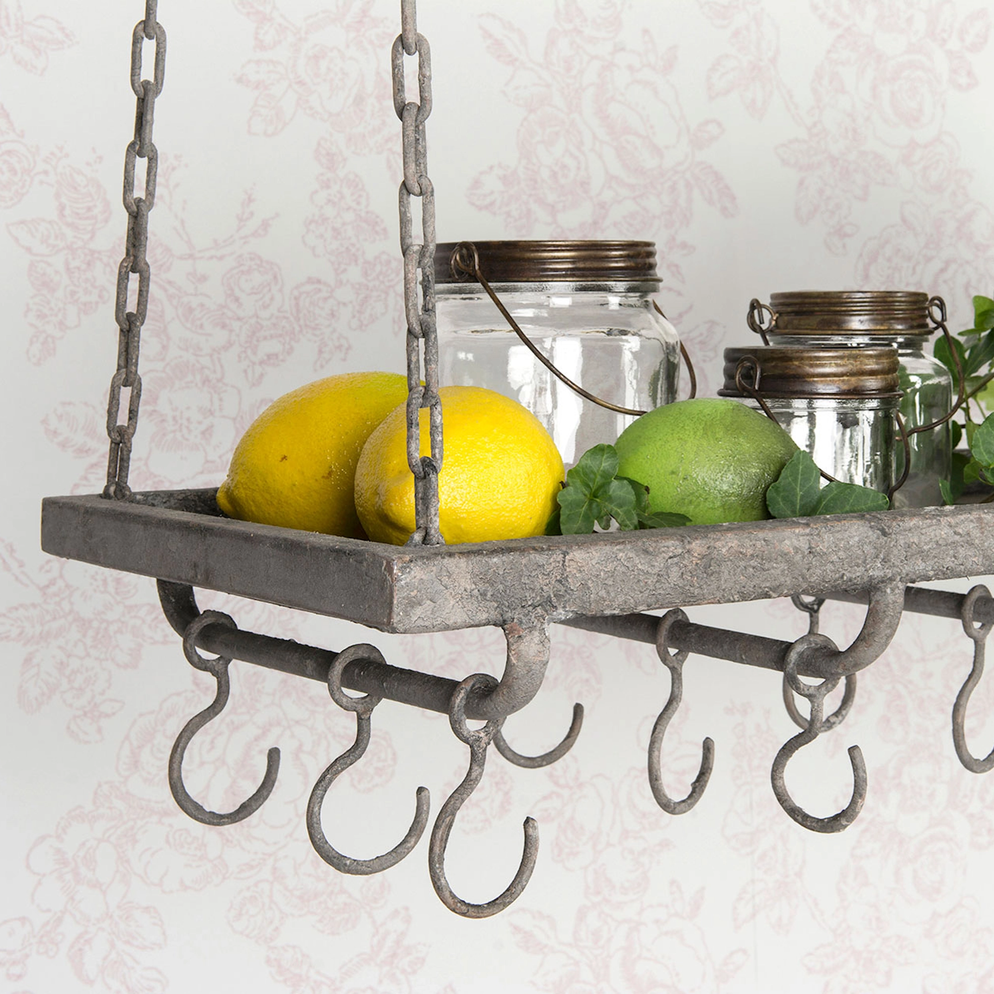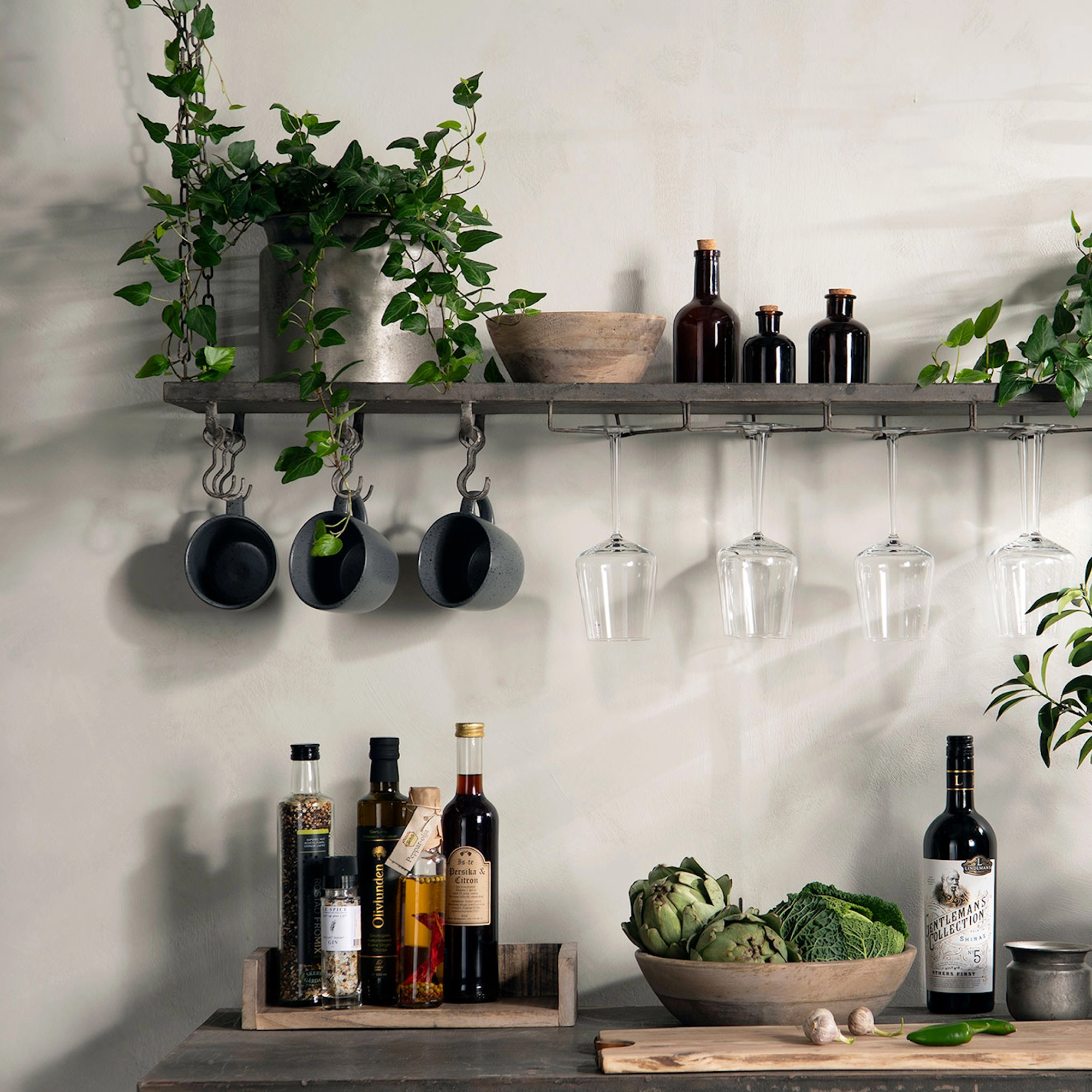 Denna hängande hylla i metall är en smart och stilren lösning för dig som vill ha både förvaring och dekoration utomhus. Hyllan hängs upp i kedjor och har ett robust hyllplan för avställning, flera krokar för redskap eller dekorationer, samt glashållare för vinglas – perfekt för sommarens grillkvällar, uterummet eller balkongen!