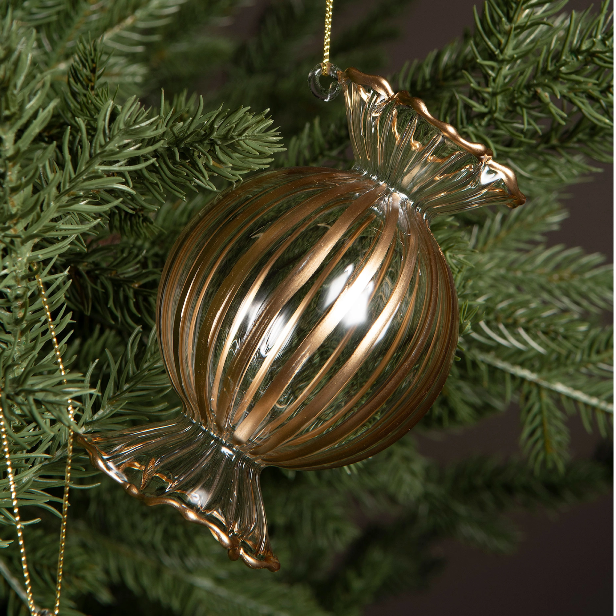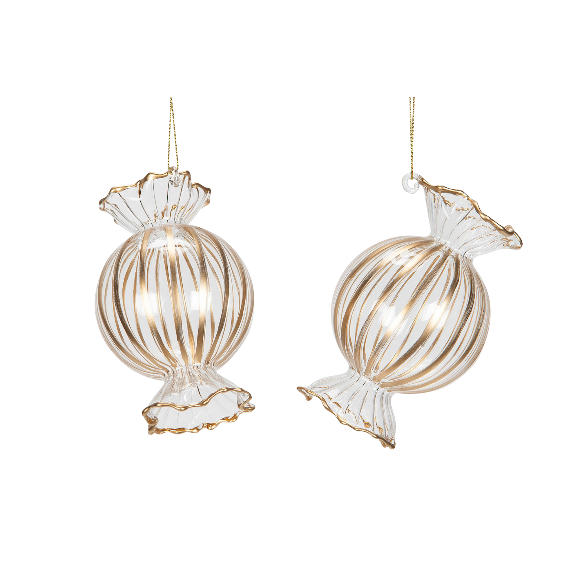 Dessa dekorativa karameller i glas är som små konstverk i granen. Den klassiska formen och de stilrena guldränderna skapar ett elegant och lekfullt uttryck som passar lika fint i traditionell julpyntning som i en mer avskalad stil.