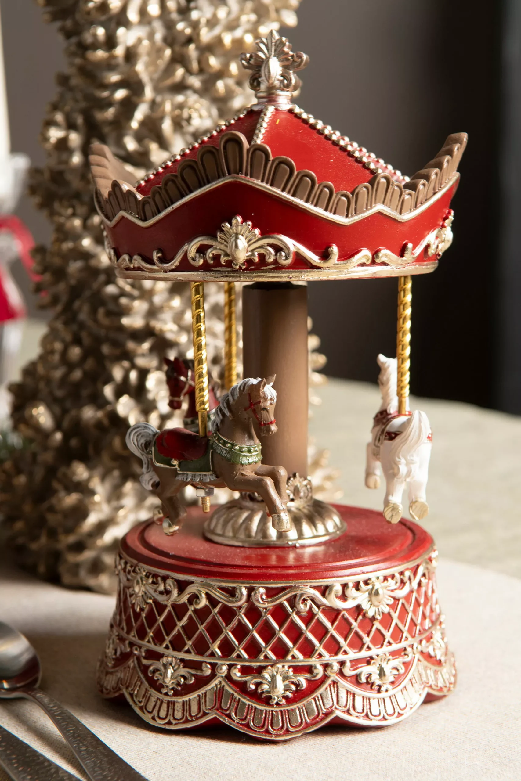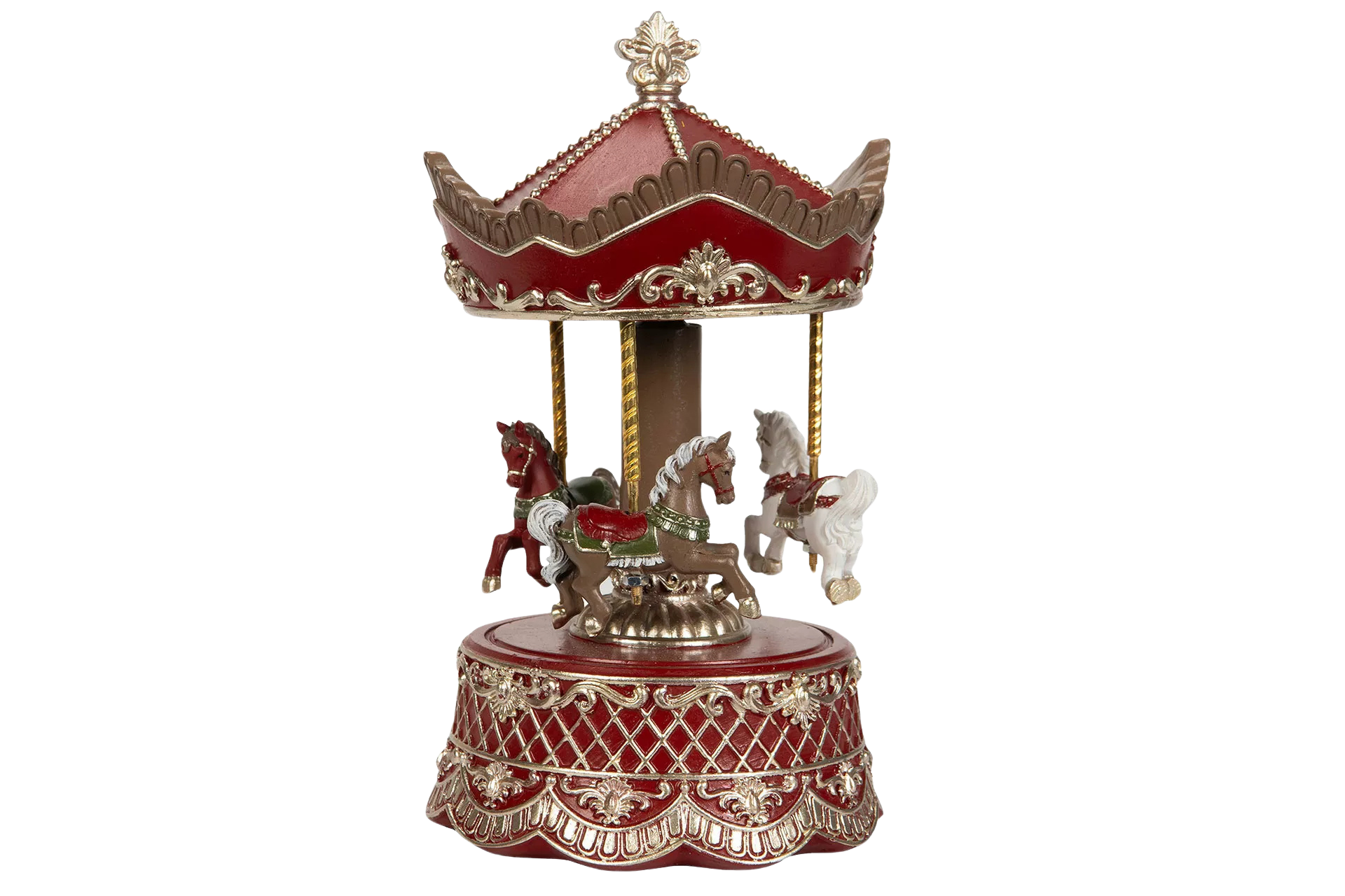 Låt julen fyllas av nostalgi och magi med denna vackra speldosa i form av en klassisk karusell. Med sina snirkliga detaljer, skimrande guldtoner och de charmiga hästarna som snurrar runt till musik, är den här speldosan ett underbart julpynt för både stora och små.
