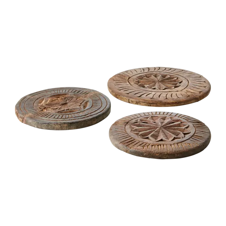 Upptäck Treasure fat, en kollektion av vackra vintage chapatifat i handsnidad teak. Dessa unika fat har en rik historia och har tidigare använts för att baka traditionellt indiskt chapati-bröd. Med sin detaljerade snidade dekoration och naturliga patina blir varje fat en one-of-a-kind inredningsdetalj.